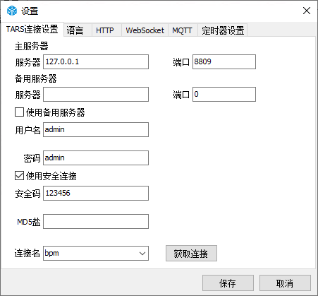 点击菜单栏中的[工具]-[设置],打开设置对话框,在TARS连接设置中修改 TARS连接设置的信息,如果是按照默认设定设置的连接,则可以直接点击[获取连接],确认是否可以获取到连接名。点击[保存]按钮。