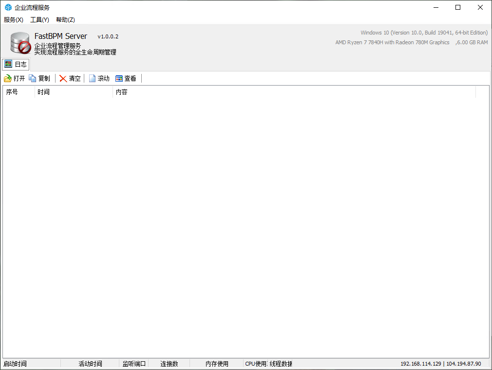 返回至主界面,点击菜单栏中的[服务]-[启动服务],启动 FastBPM 服务端并运行。