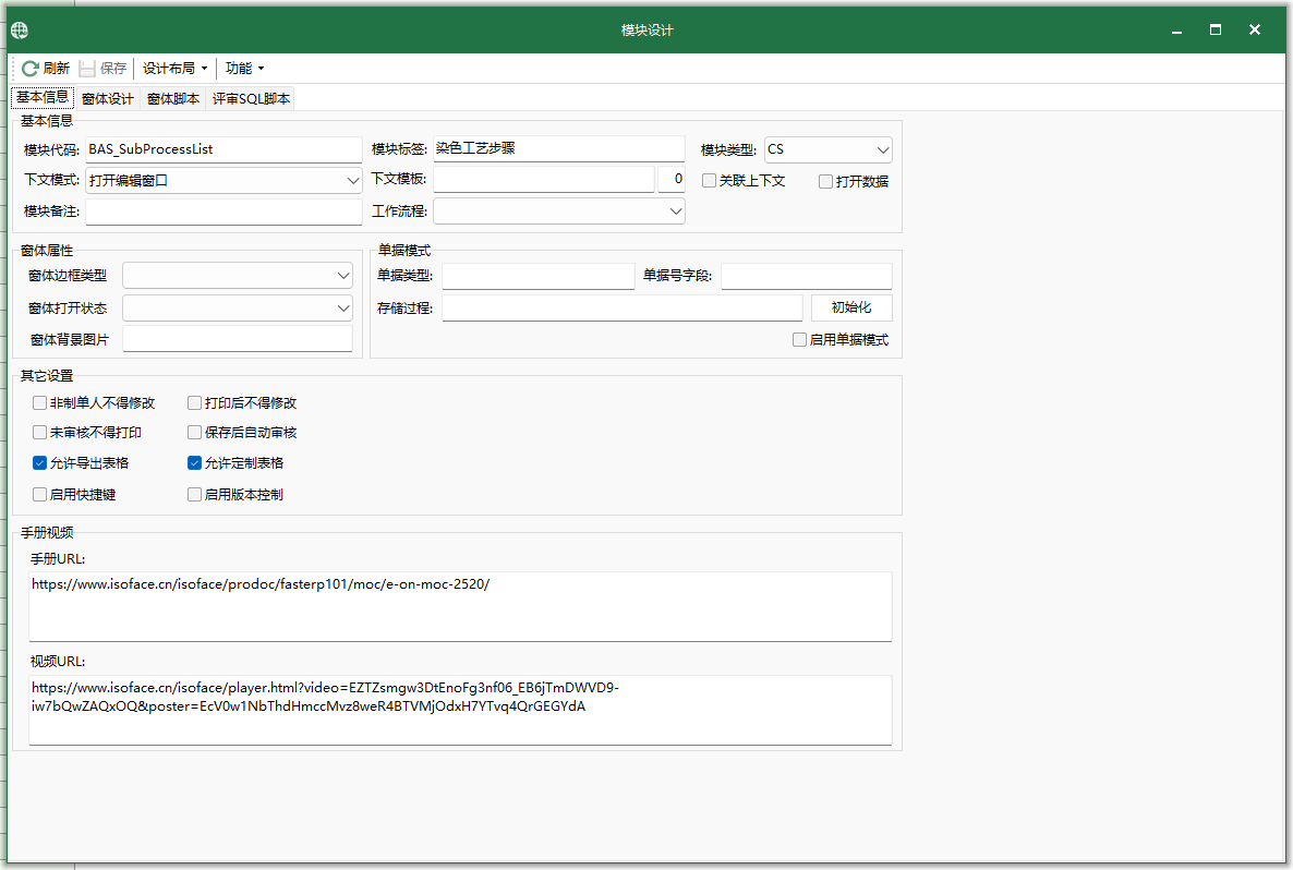 在模块设计列表界面中,点击[编辑]按钮,会打开编辑界面,在基本信息页面中,填写模块代码,模块标签等基础信息,根据需求去设置各选项。