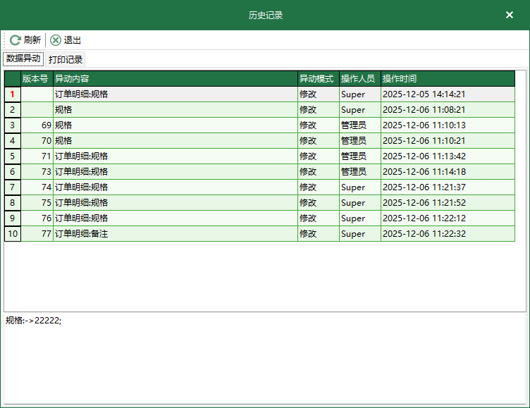 在复杂业务流程及跨部门协作中,单据信息的修改追踪尤为关键。FastERP1 的版本管理功能不仅能记录版本号变动,还可结合版本历史记录模块实现完整的审计链路。每一次保存行为都会自动生成记录,系统可清晰标注。点击单据编辑界面中的[历史记录]按钮可以打开上图显示的历史记录内容。主要提供以下字段信息: