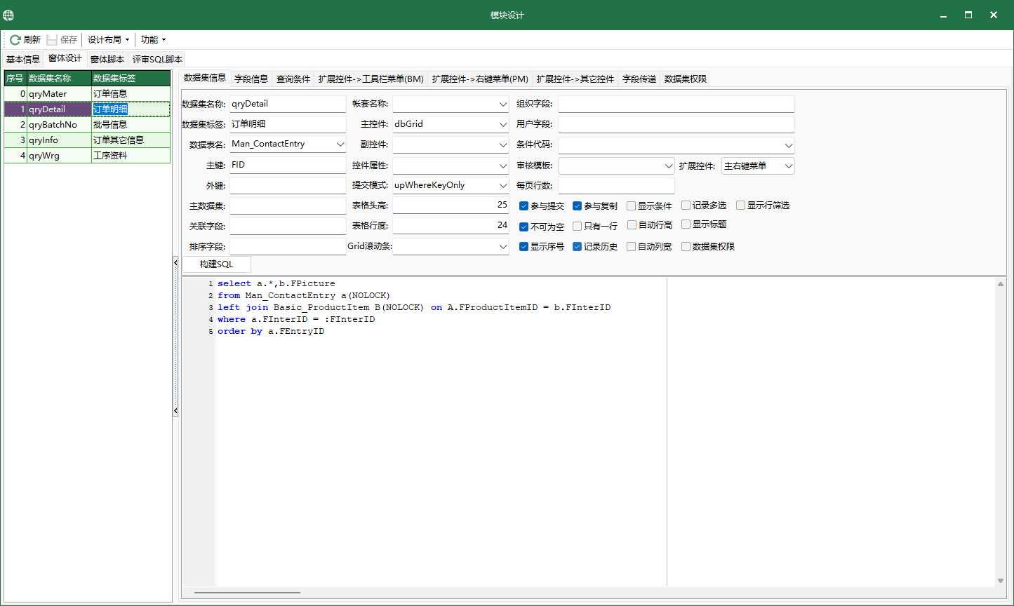 在模块设计界面中,选择要启用版本历史记录的数据集,勾选记录历史选项。