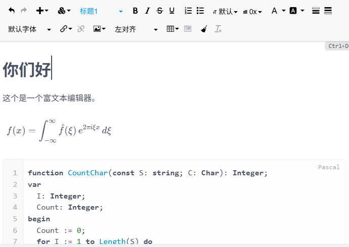 此组件表示为一个富文本编辑器,可以支持常见的文本格式化显示,同时额外支持音频视频导入、数学公式、待办事项、时间轴、步骤条等展示方式。