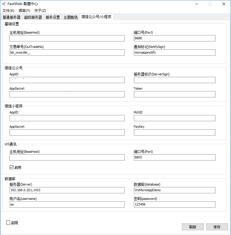 - 主机地址:配合微信服务使用的websocket服务端的地址,地址通常以