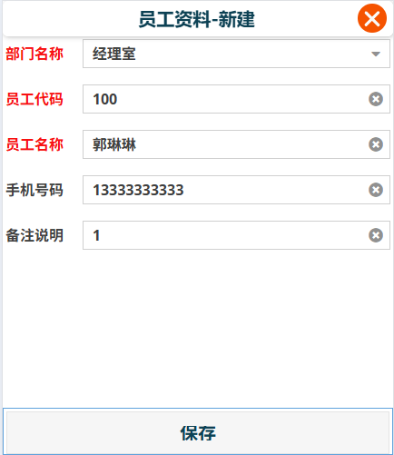 [新建]按钮,打开员工资料编辑框,选择员工所在的部门,填写员工代码/员工名称/手机号码等信息。点击[保存]按钮。