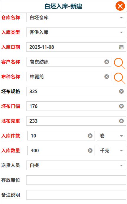 - 仓库: 新增坯布客供入库记录,并确认所建资料的准确性。