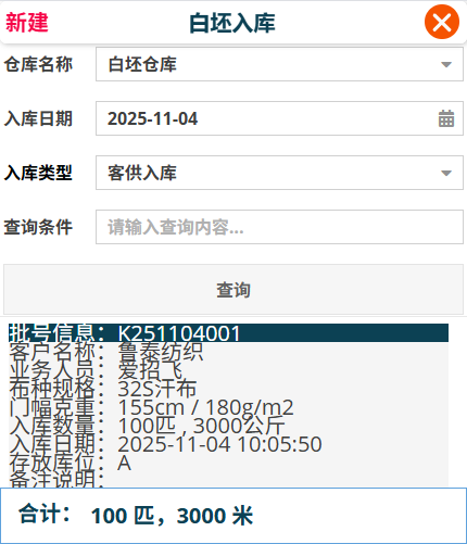 [白坯入库],打开白坯入库画面,在白坯入库画面中,可在查询条件中输入信息进行快速查询。可以查询的内容包括客户名称、业务人员、布种规格。