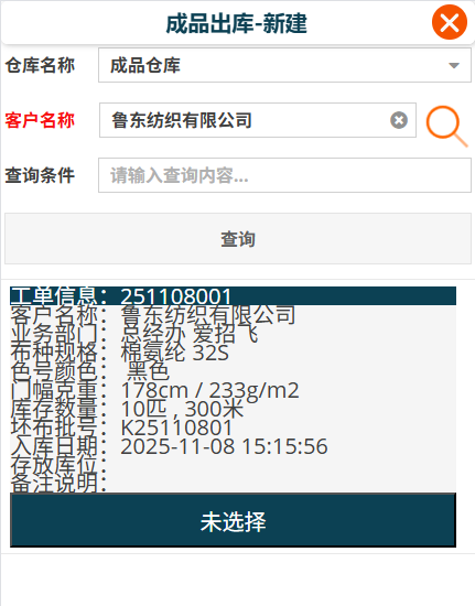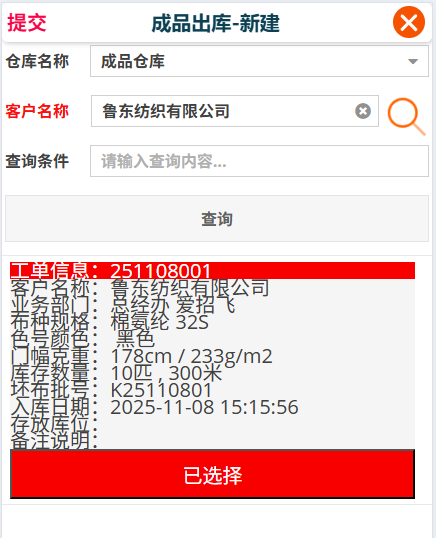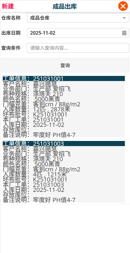 [新建]按钮,打开成品入库编辑框,选择客户名称,如有其它更精确的查询条件,可以一次输入,点击[查询]按钮。点选要出库的记录。