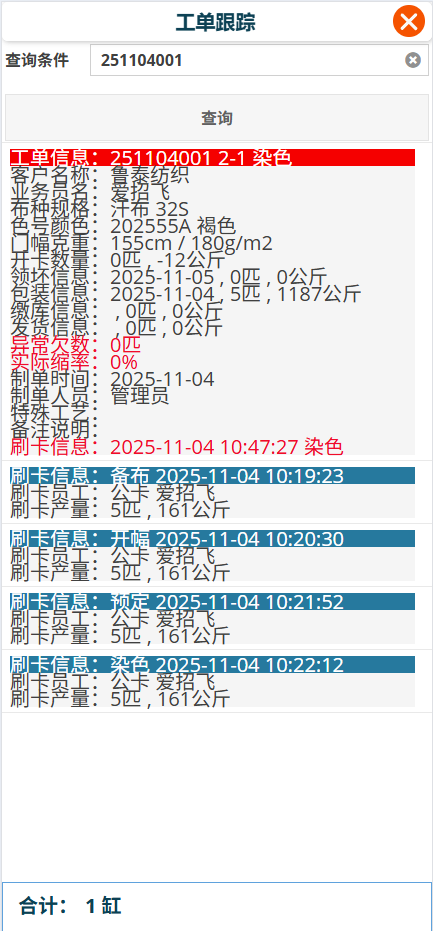 点击[工单跟踪],打开工单跟踪画面,输入要查询的坯布批号或者工单号,显示对应的工单信息。