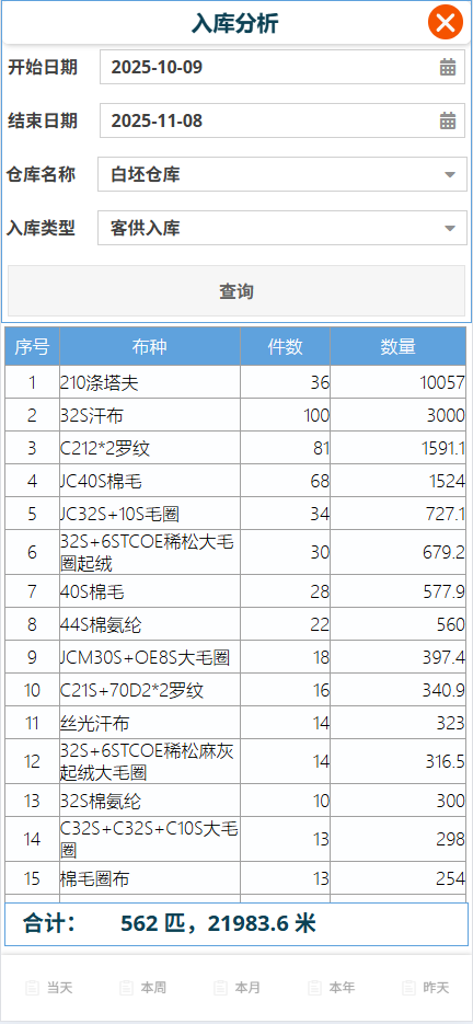 目的: 仓库在进行坯布出库、坯布入库的操作后,系统自动汇总成的表格,方便查看出入库的汇总信息,为业务流转做好准备。具体功能用法请参考坯布出入库汇总表。