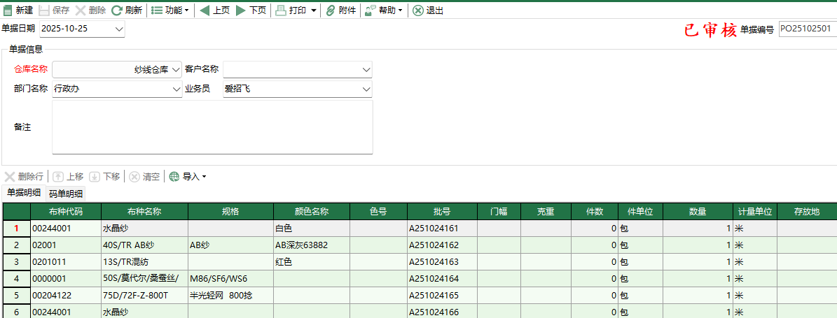 [批号]: 坯布入库时由系统生成的一串编号,通过该编号可以用于记录追踪入库的坯布的业务流向。