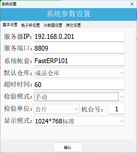 双击下方FastERP处,出现输入管理员密码的界面,在此处输入管理员密码,按[确认]按钮以打开系统参数设置界面。