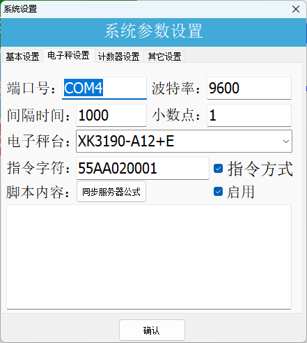 电子秤设置中,设置电子秤通讯端口协议信息,依据电子秤的说明,设定电子秤台型号于读取的指令字符。