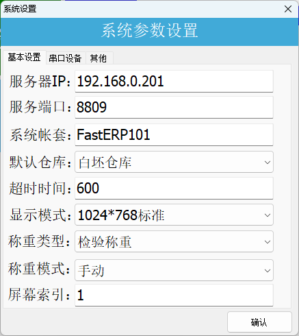 双击下方FastERP处,出现输入管理员密码的界面,在此处输入管理员密码,按[确认]按钮以打开系统参数设置界面。