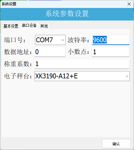 串口设备中,设置电子秤通讯端口协议信息,依据电子秤的说明,设定电子秤台型号。