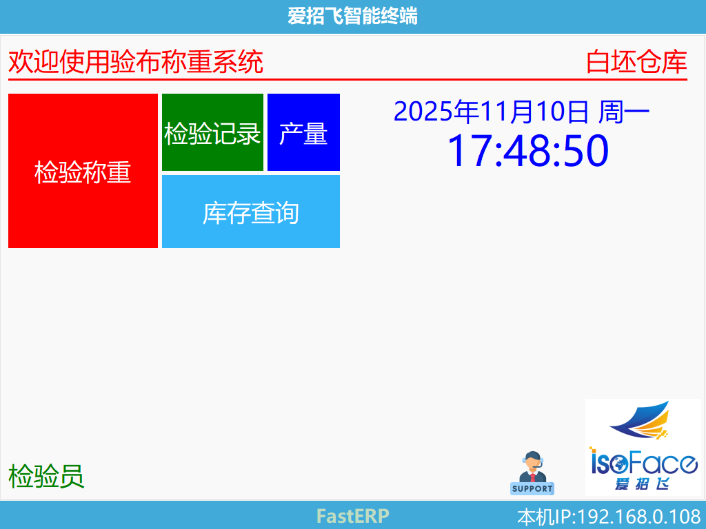 通常情况下,在此次重启完成后会自动进入到落布检验终端程序的主界面,可点击[落布称重]/[检验称重]进入到检验的主界面中,查看电子秤数值是否能正确读取。